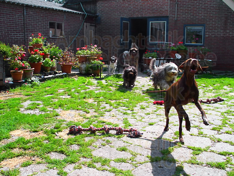 De Staander wil spelen, en daagt je uit, gooi een bal!,......die is bijna onvermoeibaar, maar de oudere honden genieten rustig van de heerlijke zon, op hun speelveld.
