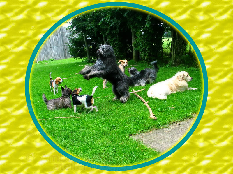 Dit is zo`n zeer gelukkige groep honden die hun vakantie vieren, met elkaar hebben ze een heerlijke tijd. Het maakt echt niet uit: of de hond nu 1 dag komt ,of dat een oude niet meer bemiddelbare hond, ziek of gebrekkig, voor de rest van zijn leven wordt gebracht, omdat de baas er niet meer voor kan zorgen, ze zijn hier altijd echt thuis, en krijgen elke liefdevolle verzorging die nodig is.