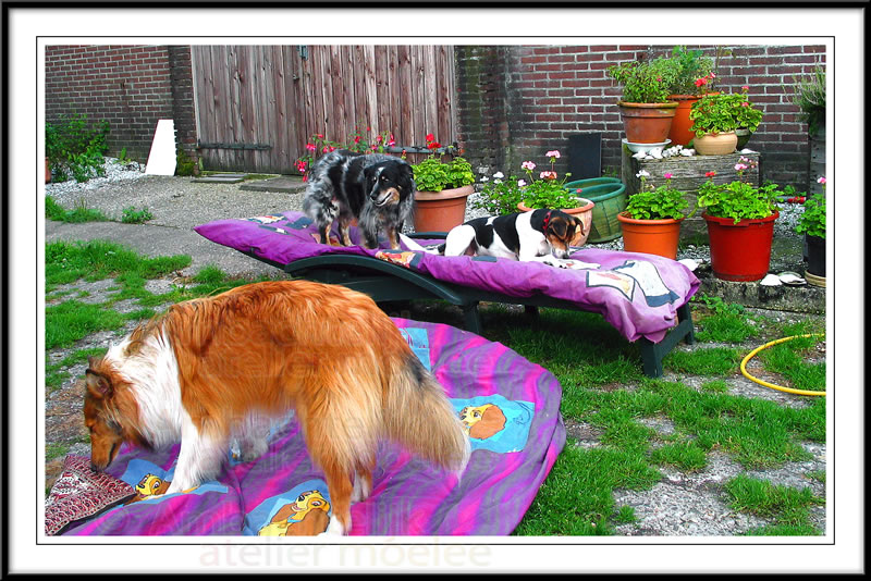 Hoog zomer, luieren, zonnebaden, op de speelkleden in de hondenspeelplaats, ....wordt je te warm? of heb je een heel dikke vacht?..., loop je toch lekker naar binnen het huis in waar de airconditioning koelt?