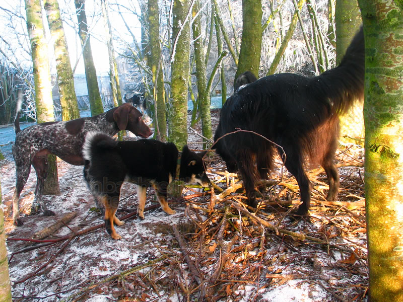 De vakantie vierende logerende honden genieten enorm van de verse zachte sneeuw op hun speelveld, met veel bravour rennen ze er zo, het woonhuis uit, in. Ze mogen ook zo weer naar binnen rennen, het is er op ingericht, en wordt dagelijks schoon gemaakt.